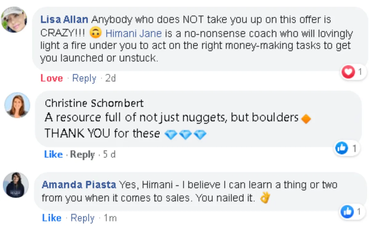 Himani implements what she talks about. She walks in with her knowledge of Sales and Live Launches. If you wanna learn how to exponentially maximize your profit, Himani is the go-to person. Everything that she shares is GOLD.